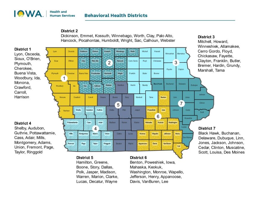 The new system consists of seven behavioral health districts that also cover substance use disorders. Disability services have moved to go with the state's aging services under the Aging and Disability Network. Both are overseen by the Iowa Department of Health and Human Services (HHS).