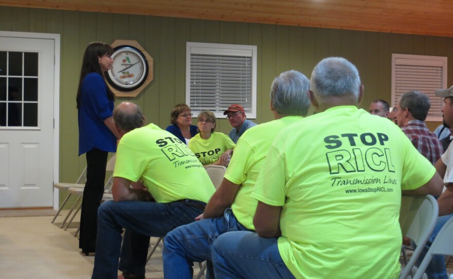 Future neighbors of the line have already begun organizing an opposition group. Here at a meeting of the newly formed Preservation of Rural Iowa Alliance, Director Carolyn Sheridan holds court. She says one of her major sticking points about the line, is that it sends wind power out of state.