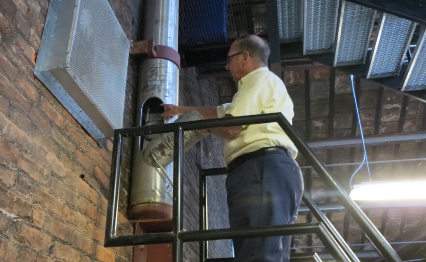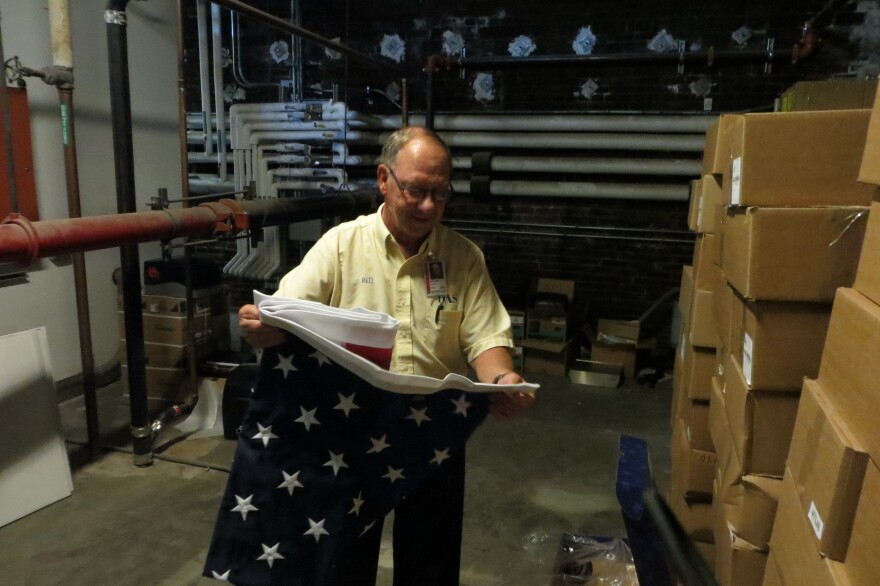 Bill Gartner is in charge of the crew that climbs into the attic to raise and lower the flags high atop the Iowa Capitol Building. A motor adjusts the main flag to the proper height.