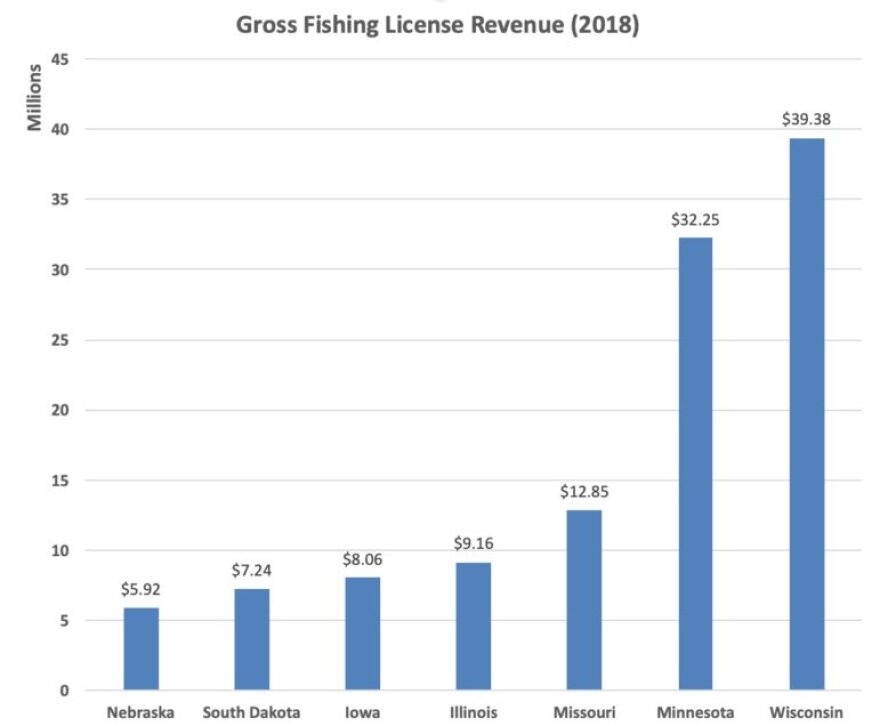 Fishing also is big business and recreational activity in the Midwestern states adjacent to Iowa: Missouri, South Dakota, Nebraska, Illinois, Wisconsin and Minnesota. Wisconsin has the largest fishing economy of these states, earning more than $39 million annually in fishing licenses.